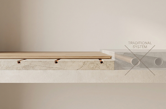 Ja, deutlich. Die Heizrohre liegen direkt unter dem Bodenbelag. Die Wärme muss nicht erst 4-5 cm Estrich aufheizen, sondern wirkt sofort. Das spart Energie und macht die Regelung viel komfortabler.